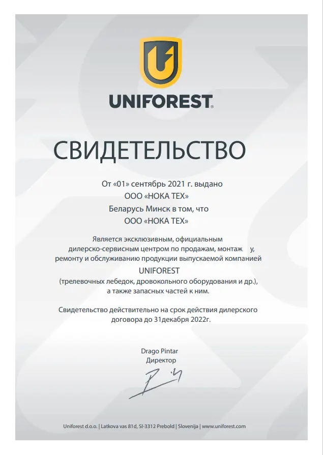 ООО «НОКА ТЕХ» является официальным представителем компании Uniforest в Беларуси. За подробной информацией и условиями поставок дровоколов Uniforest обращайтесь к нашим менеджерам по телефонам A1: +375(29)317-13-25, MTC: +375(33)675-13-25 или e-mail: info@noka.by.