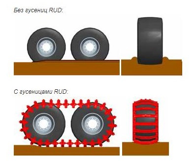 Группа компаний RUD предлагаем большой выбор цепей противоскольжения и колесных гусениц и траков для всех типов транспорта. Гусеницы производят на следующие размеры шин (колес): 700/45-22,5; 710/40-22,5; 710/40-24,5; 600/55-26,5; 650/60-26,5; 700/50-26,5; 710/45-26,5; 750/45-26,5; 750/55-26,5; 800/40-26,5.